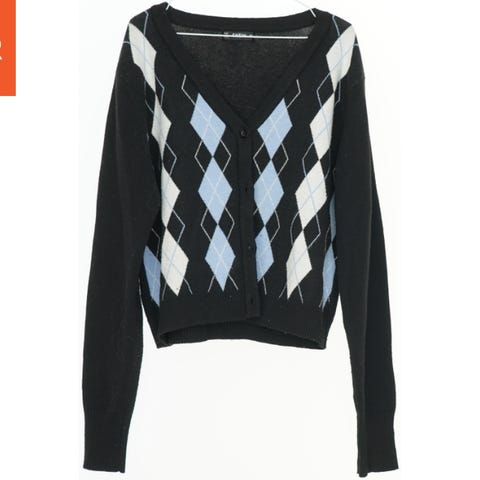 En strikket cardigan til børn med et mønstret design i farverne marineblå, hvid og rust. Den har en bred ribbet krave og lukkes med træknapper. Materialet virker varmt, ideelt til kolde vejrforhold.
