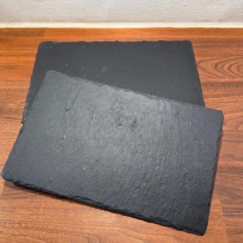 Dette er et sæt af 5 skiferplader, hver måler 30 x 15 cm. Pladerne er lavet af solidt skifermateriale, som er ideelt til servering af madvarer såsom ost, tapas, eller som dekorative serveringsfade. Bagsiden af hver plade er udstyret med små beskyttelsespuder for at forhindre skader på overflader.