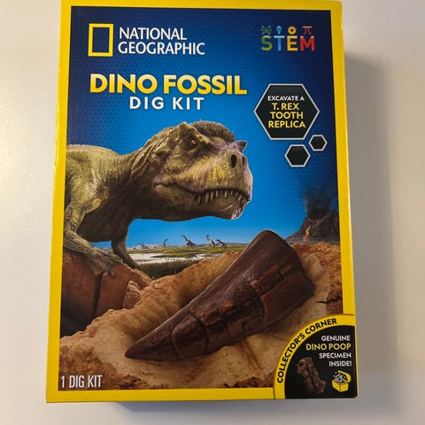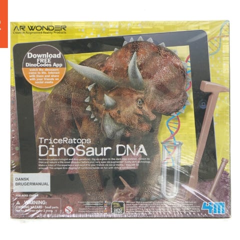 Dette er et 'TriceRatops Dinosaur DNA' udgravningssæt fra AR Wonder, der giver mulighed for interaktivt at lære om dinosaurer ved hjælp af augmented reality. Sættet indeholder værktøjer til at grave en lysende skelet ud og samler dinosaurens DNA-fragmenter med den medfølgende mobilapp. Der er instruktioner og manual på dansk, og det anbefales til børn over 8 år. Sættet er pakket i en æske med dimensioner 24x22 cm og kan forbindes med apps for at få klædet oplysninger om dinosaurerne og del sjov med venner.
