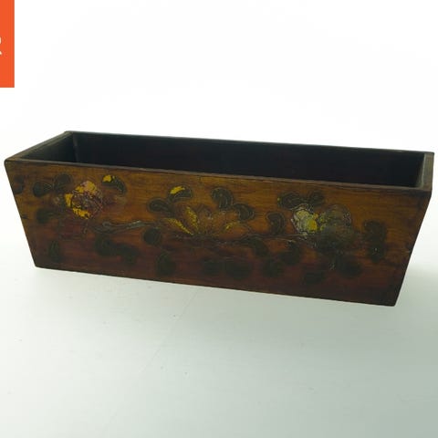 Denne dekorative trækasse er rektangulær og har målene 23x13 cm. Den er lavet af træ og har indviklede geometriske mønstre på toppen og siderne, der fremhæver dens kunstneriske design. Kassen har en åbenbar låge og tilbyder opbevaring indeni til små genstande. Den elegante mosaikdesign gør den til en fremragende indretningsgenstand, som kan tilføje karakter til ethvert rum. Kassen er solid og har en varm brun farve.