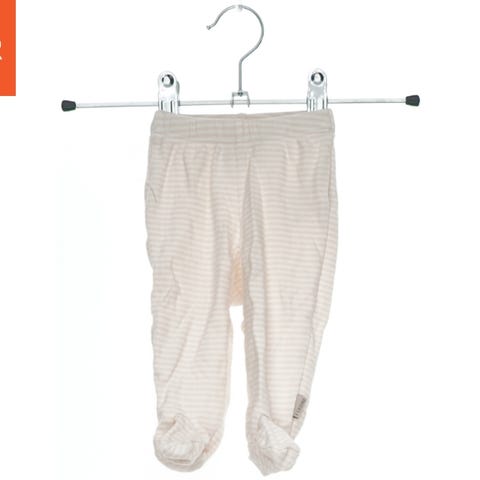 Et par beige babybukser med ribbet tekstur og knapper nederst på benene. Bukserne ser ud til at være lavet af en blød bomuldsblanding med elastisk talje.