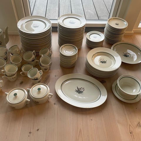 Der er kopper, underkopper, sidetallerkener, flødekande, sukkerskål, kaffekande og kagefad - som det fremgår af billederne. Der er ingen skår eller afslag, men enkelte dele er krakeleret (som det er vanligt for Aluminia).