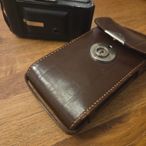 Dette er et vintage Coronet kamera i en kompakt størrelse på 17x7,5 cm. Kameraet kommer med en tilhørende brun lædertaske, der har en bærestrop og metalklås. Kameraet har en tydelig retro stil og er lavet af metal med nogle rustpletter og sort belægning. Det kan være et stykke for samlere eller dem, der er interesseret i analog fotografering.