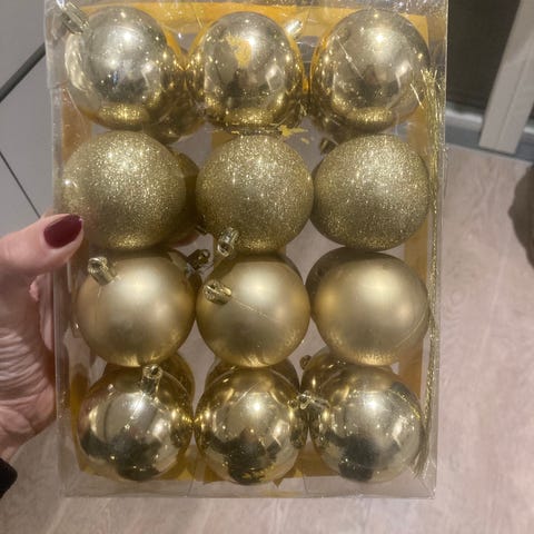 Dette er et sæt af 11 guldfarvede julekugler. Kuglerne er ensartede i størrelse og har en skinnende gylden finish. De har en lille metalholder på toppen, der gør det nemt at hænge dem på juletræet eller vælge at bruge dem som dekoration.