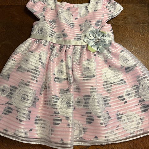New Look børnekjole i størrelse 80 til piger. Kjolen er lyserød og lavet af organza materiale. Designet med blomstermotiver og tynde stropper.