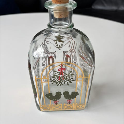 En glasflaske med dekoration fra Holmegaard. Flasken er cirka 18x9 cm i størrelse og har et design med juletema, herunder en krans og stearinlys. Det klare glas gør flasken ideel til dekoration eller som en samlerobjekt.
