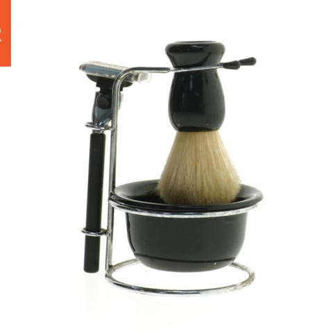 Sættet består af en barberholder, en barberkniv og en barberbørste. Holderen er lavet af metal og har en rund base med to arme til at holde barberkniven og børsten. Barberkniven har et langt blåt håndtag. Barberbørsten har naturbørstehår og et rundt håndtag med måske branding. Størrelsen på holdestativet er 15 cm.