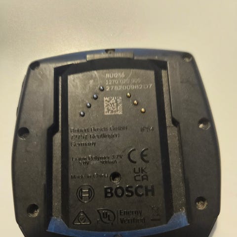 En cykelcomputer fra General Technic med en digital skærm. Den har en kompakt størrelse på 5,5x5,5 cm og en flad bagside med monteringselementer, som gør det muligt at fastgøre enheden til en cykel. Der er tre knapper i bunden, farvet blå, rød og sort, til betjening af forskellige funktioner. Enheden har slidtegn og en smule skidt, hvilket indikerer tidligere brug.
