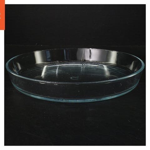 Dette er en rund sandkageform med en diameter på 33 cm. Den er fremstillet af metal og har en sort finish. Formens indvendige overflade er flad med let slid, men strukturen er stadig intakt.