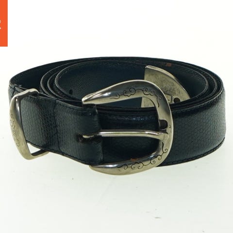 Sort læderbælte, bredt, med læderbetrukket spænde. Bæltet er præget med krokodillemønster. Størrelsen af bæltet er 72 cm til det første hul.