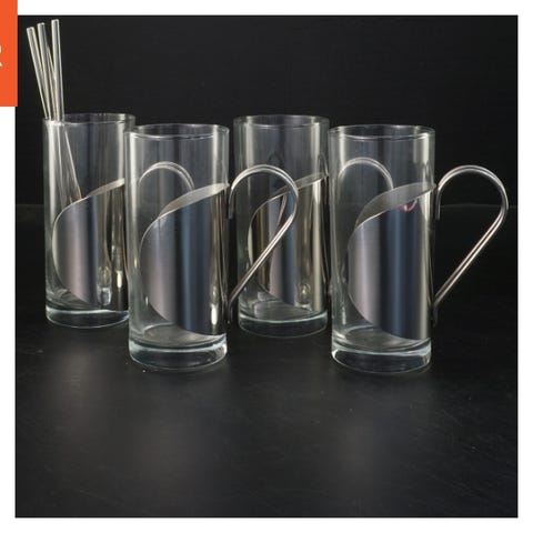 Sæt bestående af seks cylindriske glas, hver med en tilhørende metalhåndtag for nemmere greb. Disse glas kan anvendes til servering af både kolde og varme drikke. Glasset er klart, og metalhåndtaget giver det et moderne look. Målene på hvert glas er 13,5 cm i højden.