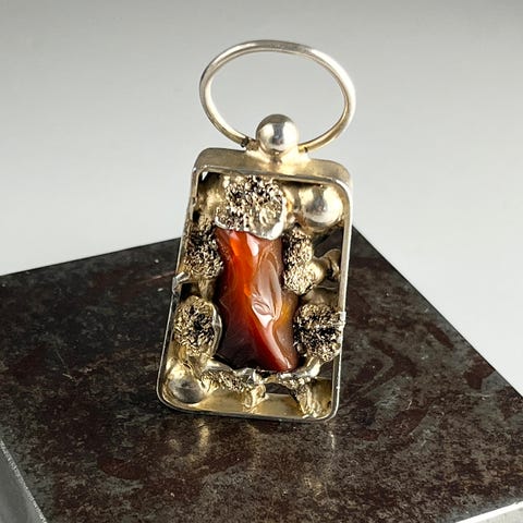 Et lille miniature vedhæng formet som Arc de Triomphe, lavet af sølvfarvet metal. Det har en størrelse på 1x1 cm med en tydelig bøjle for fastgørelse til en kæde. Medfølgende original æske fra A. Dragsted, en dansk guldsmed med adresse og telefonnummer trykt på. Velegnet som en del af et smykke såsom en halskæde eller armbånd.