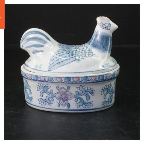 Denne genstand er en keramikfigur formet som en kanin, der holder et æg. Den er hvid i farven og har en glat overflade. Figurerne måler 14 cm i højden. Undersiden af figuren viser tegn på slid eller mulig skade.