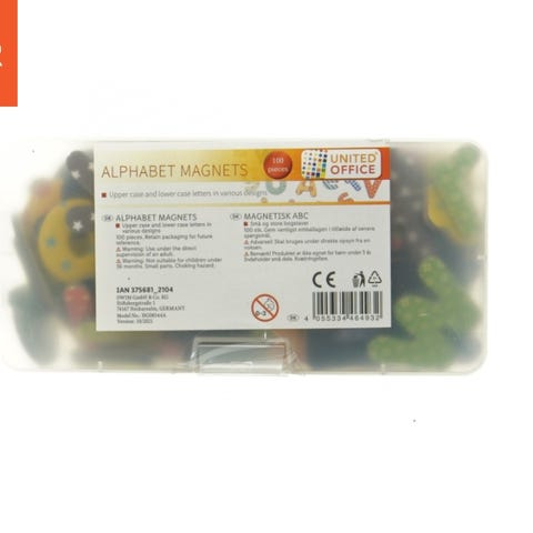 Alfabet magneter i plastikboks fra United Office (str. 100 stykker)