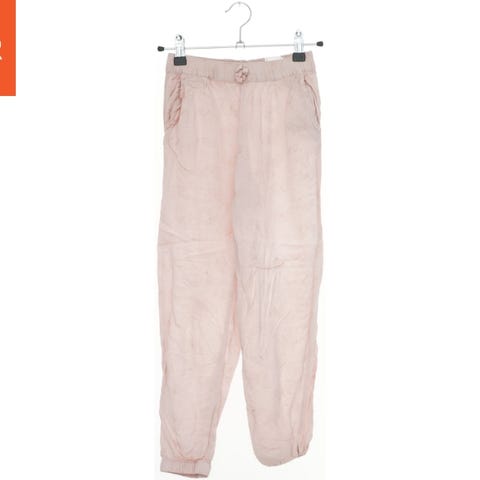 Et par børnefløjsbukser i rosa farve. Buksen har en elastisk talje og ser ud til at være uden knap og lynlåslukning. Der er synlige lommer foran. Bukserne ser ud til at være i god stand uden synlige skader eller pletter.