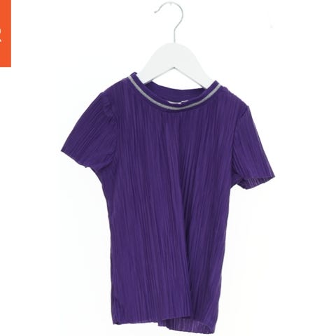 En lyserød, langærmet T-shirt med små vandrette striber. Trøjen har en enkel rund halsudskæring og er lavet af et strækbart materiale. Størrelsen angivet på mærket er 94. Velegnet til børn.