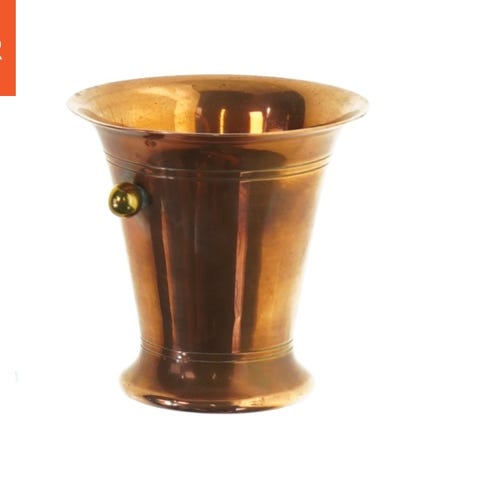 Denne vase er lavet af kobber og har en højde på 12 cm. Vasen har en bred kant øverst og en smal, afrundet bund. Overfladen viser tegn på naturlig patina og slid, hvilket giver den et vintage udseende. Vasen kan bruges som dekoration eller til at holde blomster.