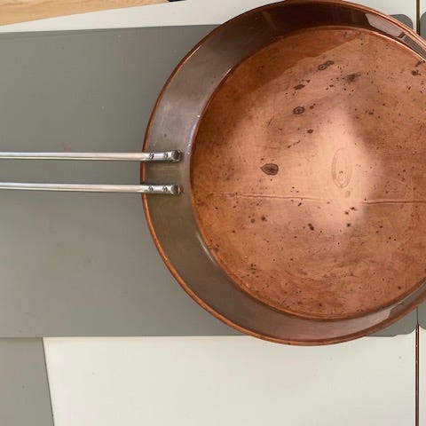 Stegepande lavet af kobber med en diameter på 30 cm. Den har en lang håndtag og viser tegn på ælde og brug. Kobberet har en naturlig patina, typisk for brugte kobberprodukter. Ideel til køkkenbrug eller som en dekorativ genstand.