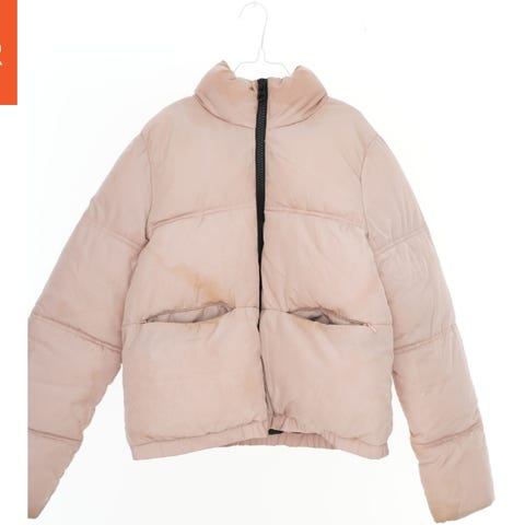 Jakke med høj krave og lange ærmer. Jakken har en quiltet mønster med horisontale syninger. Den lukkes foran og har lommer på hver side.