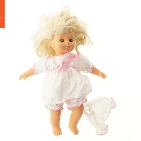 Måske Barbie.Dukken er klædt i en elegant, hvid blonderkjole og har en fascinerende hat med blomsterdetaljer. Den bærer også et armbånd som tilbehør. Dukken er ca. 30 cm høj og udstråler en vintage følelse.