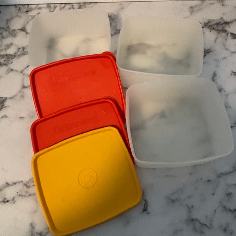 Dette er et sæt af tre trekantede plast opbevaringsbokse med låg fra Tupperware. To af dem har røde låg og en har et blåt låg. De kan bruges til madopbevaring eller organisering. Hver boks måler 13 cm i længden.