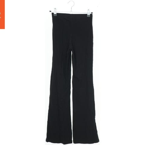 Bukserne er sorte og har en knaplukning foran. De har lommer både foran og bagpå. Et mærke hænger fra en af lommene, hvilket indikerer at bukserne er nye eller har været let brugte.