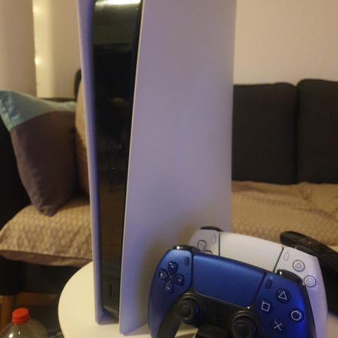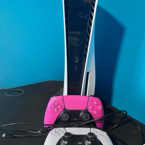 Playstation 5 spillekonsol med to controllere (en hvid og en sort) og tilhørende kabler. Konsollen har et hvidt kabinet med sort detalje og er designet til hjemmeunderholdning og gaming.