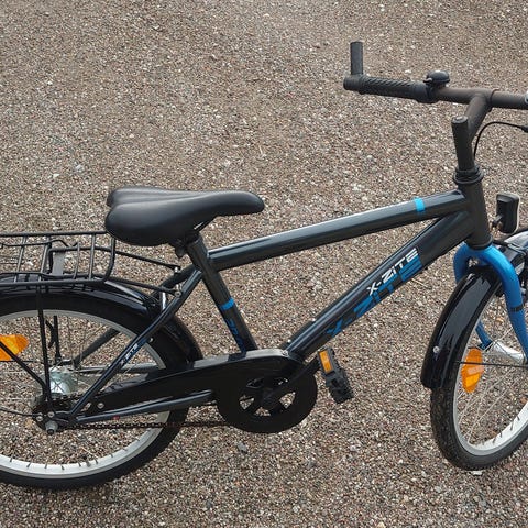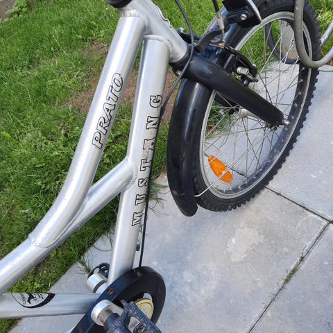 Mustang børnecykel med 20 tommer hjul i sølvfarve. Cyklen har en robust ramme og er udstyret med bagagebærer. Designet til børn, egnet til daglig brug og transport.
