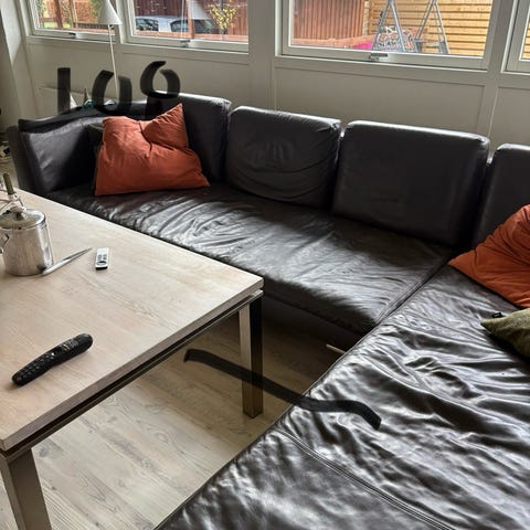 Hjørnesofa i sort læder på alle flader - med flere siddepladser. Sofaen har polstrede ryglæn og armlæn, hvilket giver støtte og komfort. Velegnet til stuer eller opholdsområder.