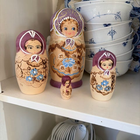 Babuska samle dukke. 5 dukker ialt . Som ny. Dog en hårfin , ikke revne, markering. Se billeder. Højde 11 cm. Sender gerne men ikke med fiksfærdig.