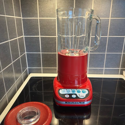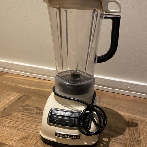 Kitchenaid Artisan blender med glasbeholder og ekstra plastikbeholder. Udstyret med flere hastighedsindstillinger og knapkontrol. Velegnet til blanding af forskellige fødevarer og drikkevarer.