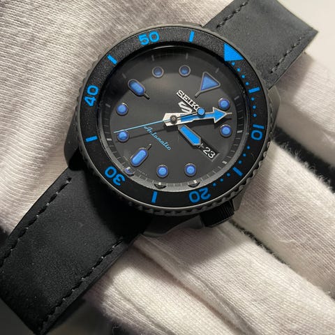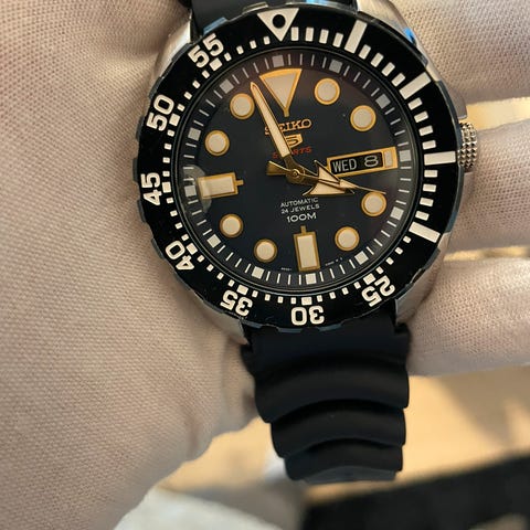 Velholdt Seiko 5 sport diver steel 43 mm. With rose gold tone Black dial ure til salg !