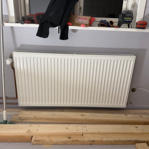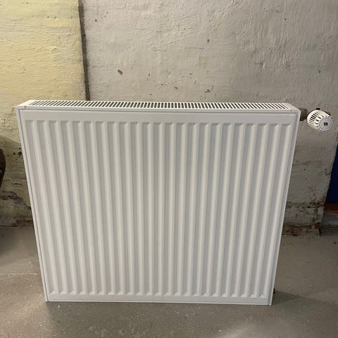 Hvid metal radiator til vægmontering med ribbet frontpanel. Velegnet til opvarmning af rum i bolig eller erhverv. Monteres på væg og tilsluttes centralvarmesystem. Ingen rust.