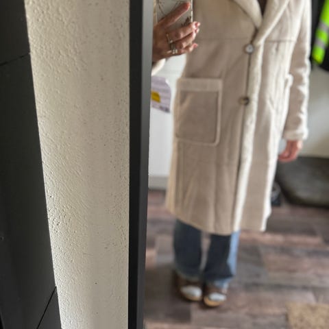 Jakken er en sort shearling-frakke/jakke , også kendt som en lammy coat. Den er lavet af ruskind på ydersiden med et blødt, klippet fåre- eller lammeuldfor på inderside