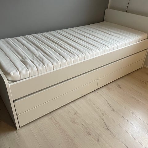 Udtræksseng fra ikea med opbevaring og 2x madrasser. Sengen er pakket sammen og derfor er der ikke et billede af den.