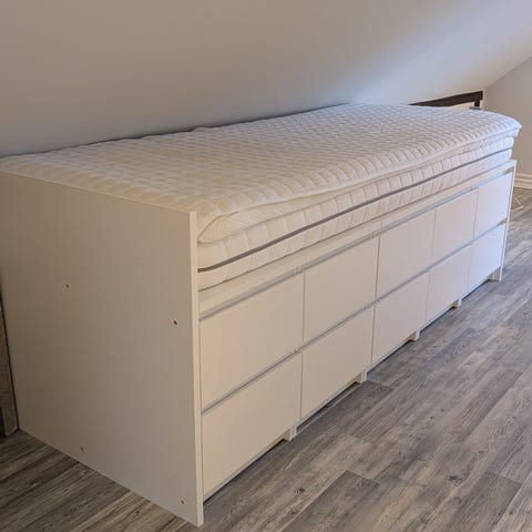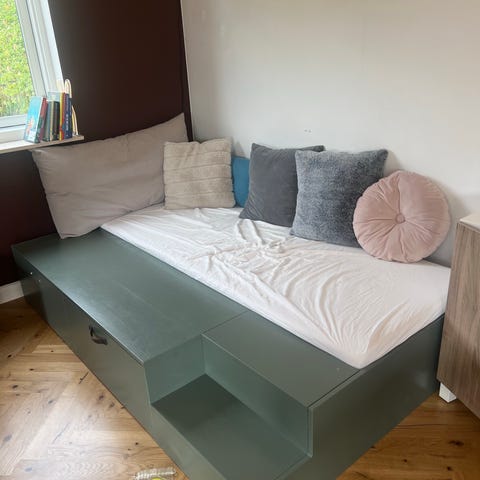 80x200 seng kan trækkes ud til en dobbelt seng. Kommer med 2 madrassen.