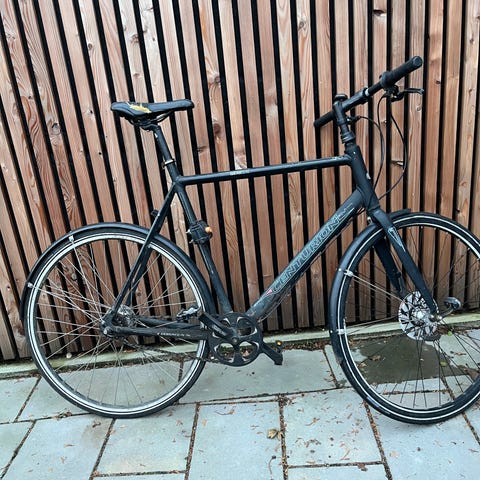 Centurion Mand cykel af typen Andre. Cyklen har en blå ramme og er designet til mænd. Den er udstyret med skivebremser og bagagebærer. Baghjulet er dog fladt..cyklen sælges da den er blevet for lille til min søn på 180 cm, perfekt til 170 cm