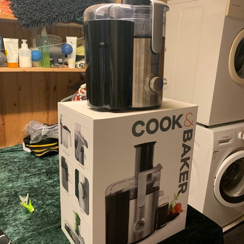 Cook & Baker Slowjuicer i sort farve med tilhørende beholdere og tilbehør. Designet til langsom presning af frugt og grøntsager for at bevare næringsstoffer.