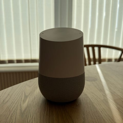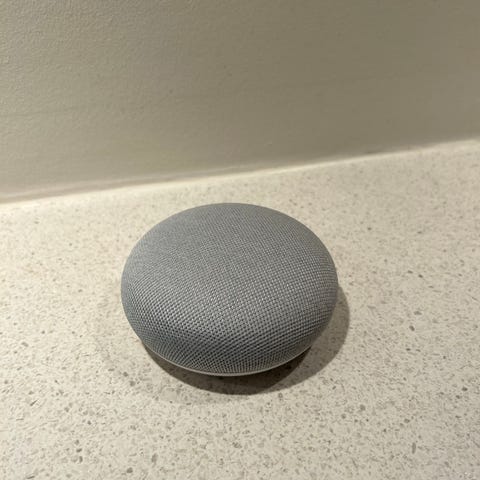 Google Google Home smart højttaler i hvid farve. Enhed til stemmestyret betjening og afspilning af lydindhold.