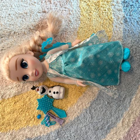 Disney Elsa dukke - 38 cm med blå kjole og langt blondt flettet hår. Dukken kommer med en lille Olaf figur som tilbehør.