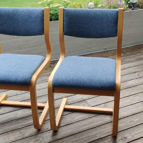2 frisvinger spisebord stole med flet ryg, træramme lakeret bøg, stel hvidmalet metal. Sæderne er med blåt velourlign stof, som er uden brugsspor. Lette brugsspor på stel