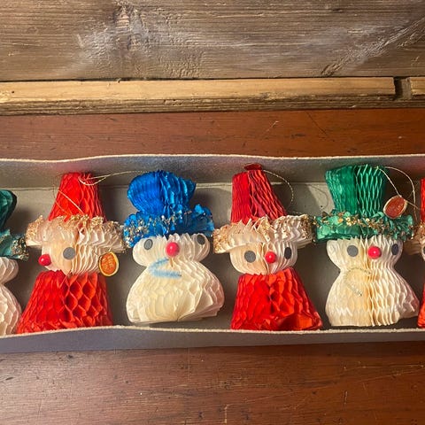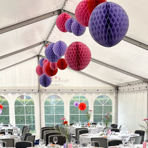 5 Små skønne honeycomb "kugler" til ophæng, den ene er foldet ud, så det klister der er på er brugt men der kan sættes nyt af en eller anden slags ovenpå.