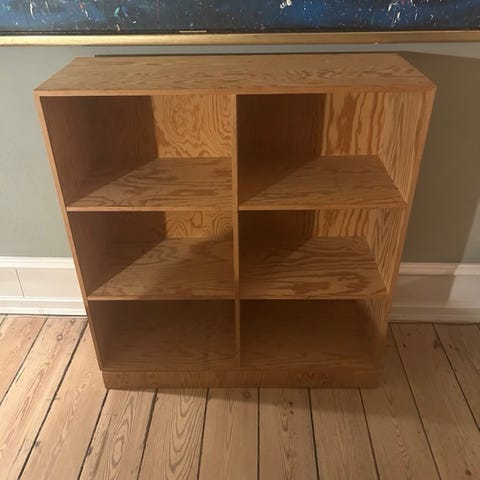 At Bo reol meget velholdt i bøg med tilhørende sokkel. Der følger 2 hylder med som måler D: 28,3 cm, B: 33 cm og 2 hylder som måler D: 32,7 cm, B: 33 cm. Ophæng medfølger ikke sælges samlet ialt