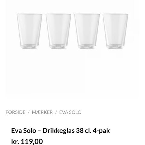 Eva Solo glas i klart glas. Sættet indeholder flere glas, der er designet til almindelig brug til drikkevarer. Glasene har et enkelt og funktionelt design. Der er 8 stk i alt. De har alm. brugsskrammer, men ingen skår eller større skader. Tåler opvaskemaskine
