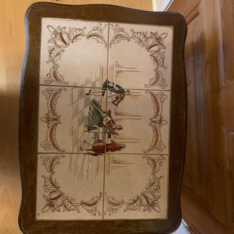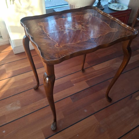 Antik 1 sæt borde træ med dekorative indlægninger på bordpladerne. Sættet består af tre borde i forskellige størrelser, alle med buede ben og detaljerede kanter. Bordene kan bruges som sideborde eller til dekoration i stuen.