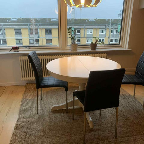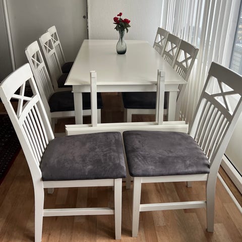 Ingatorp spisebord med udtræksplade og 6 Ingolf stoles, 2 klapstole samt 8 hynder. Købt i Ikea 15. december 2023. Se billeder med mål og kvittering.