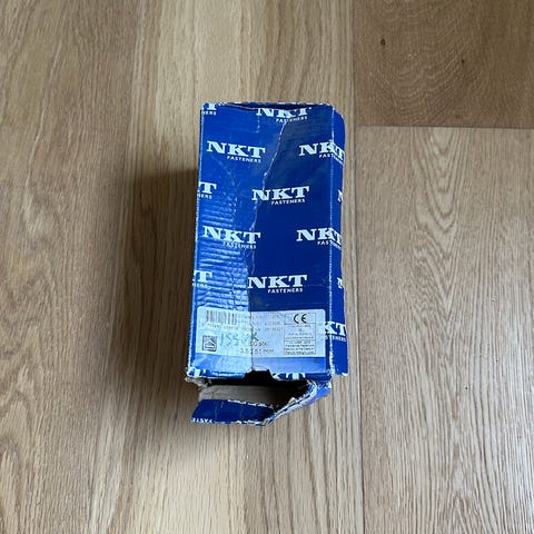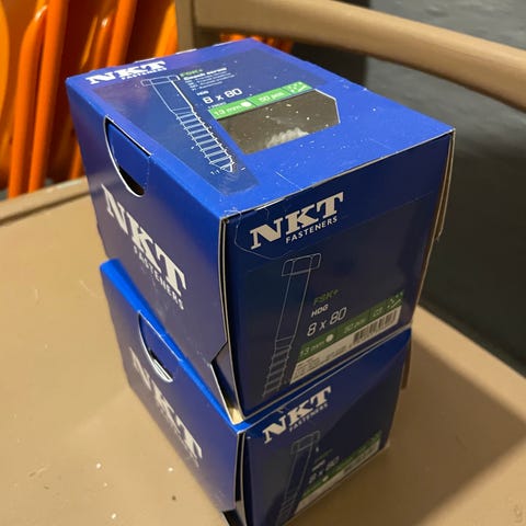En kasse NKT Fasteners FSK+ franske skruer (coach screws) i dimension 10 × 90 mm.