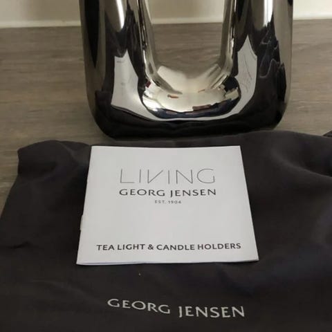 Georg Jensen lysestage i helt perfekt stand uden form for brugsspor. Højde uden lys 44 cm. Originale GJ lys medfølger