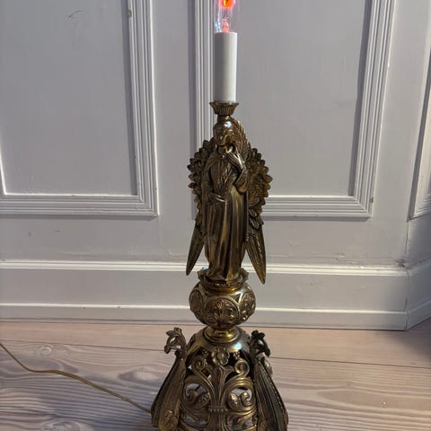 Antik bordlampe med beige skærm dekoreret med mønster og detaljer i messing. Lampen har flere arme med lyskilder og en firkantet base med ornamentik. Materialer inkluderer metal.