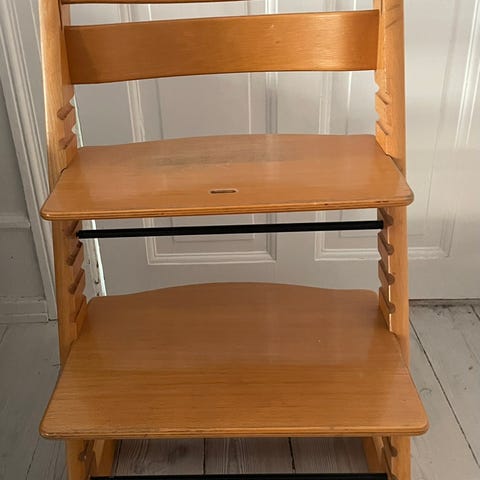 Stokke børnestol med beige polstring og justerbar sele. Stolen har en formtilpasset setepute for komfort og sikkerhet. Passer til barn og gir støtte under måltider og aktiviteter.